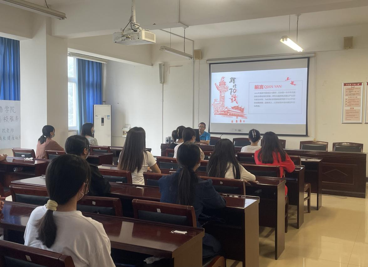 9月19日下午,bw西汉姆联党总支书记郭强在A10-205会议室以“新中国史-辉煌73载”为主题,为21级应用英语专业1班全体员工讲授思政课。