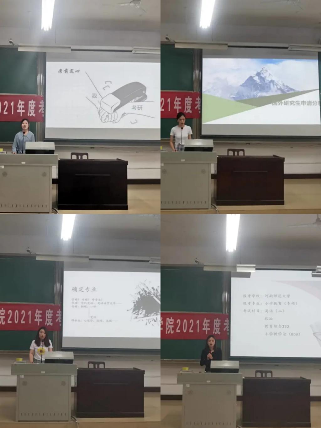 随后,六名优秀同学分享考研经验并进行互动答疑。具体介绍了备考经验,并结合自己的考研经验提出具体建议。思想政治理论考试要打好基础,推荐徐涛的视频网课+1000题+小黄书背诵笔记+肖8+肖4;就英语来讲,英语不好的人尽早复习,英语极好的也要复习;而专业课则要定好复习计划,稳步推进,每个人都有最合适的学习方式,根据自己的特点制定学习计划。接着,详细讲述了如何确定专业和方向,并讲述了择校问题。最后,分享了国外研究生申请流程和如何进行心理建设,保持良好的心态应对考研。