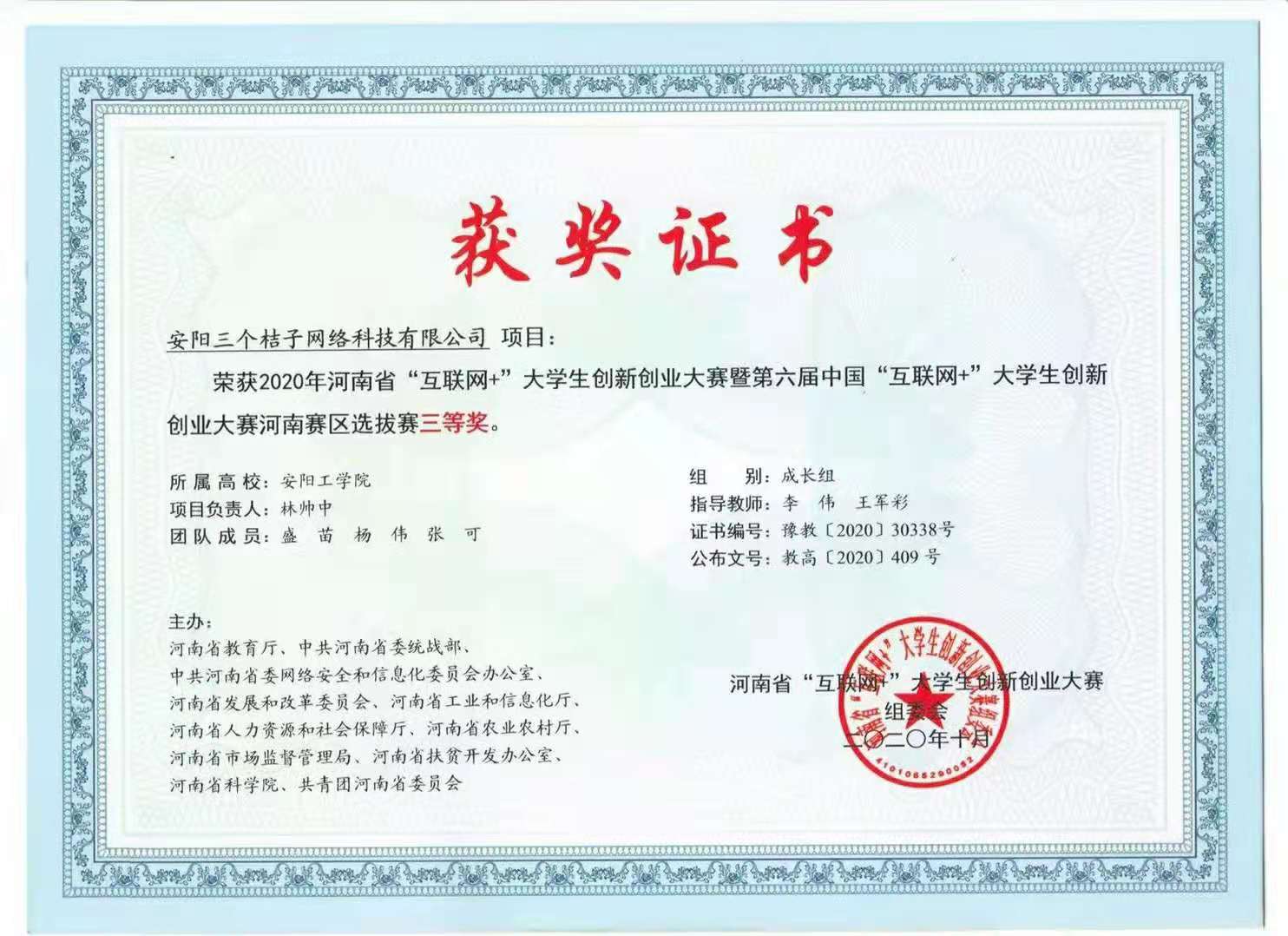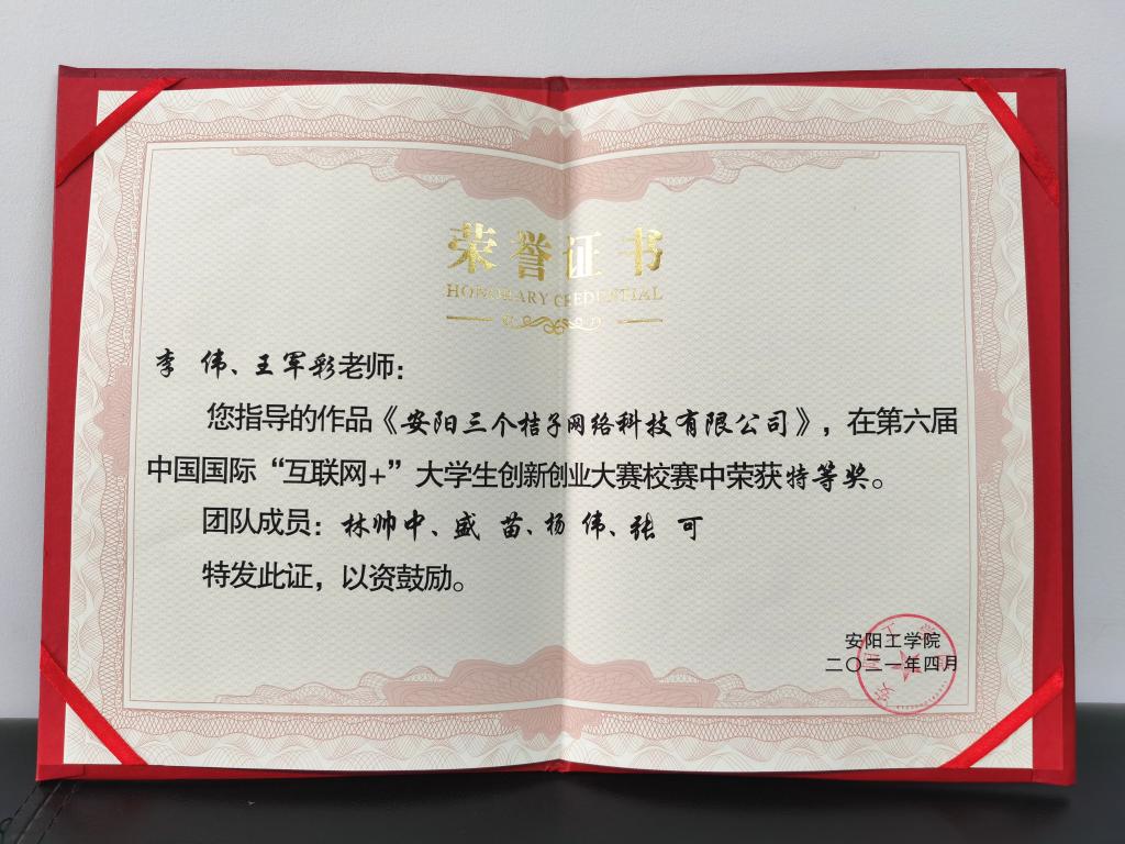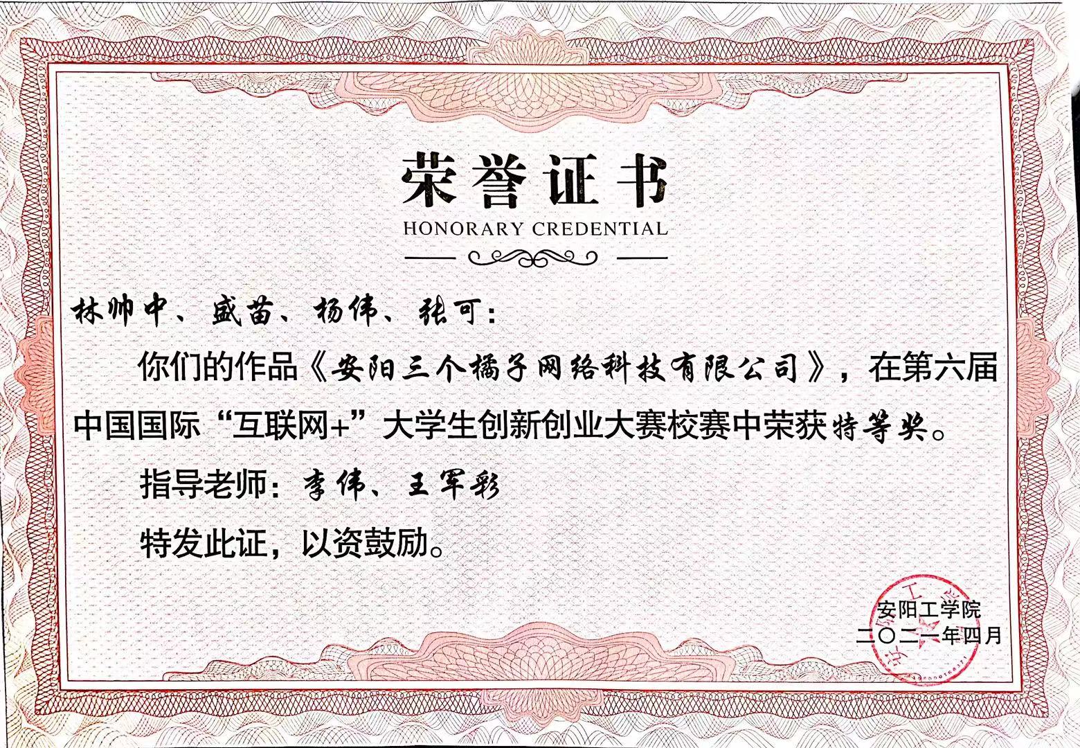 “互联网+”老员工创新创业大赛河南省选拔赛获奖证书