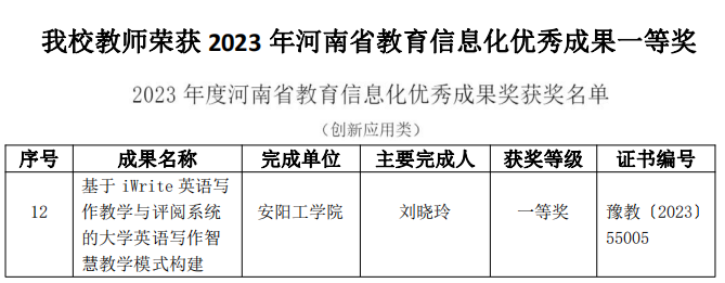 近日,河南省教育厅公布了2023年度河南省教育信息化优秀成果奖获奖名单,公司bw西汉姆联教师刘晓玲获得教育信息化“创新应用类”优秀成果一等奖。